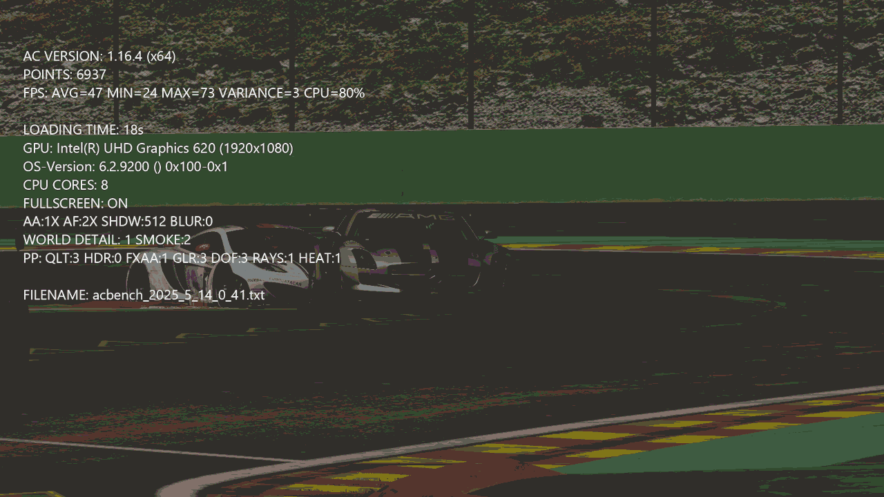 If you’re wondering whether Assetto Corsa is playable on the Intel Core i5-8250U laptop CPU and its Intel UHD 620 integrated graphics, the good news is that it is.